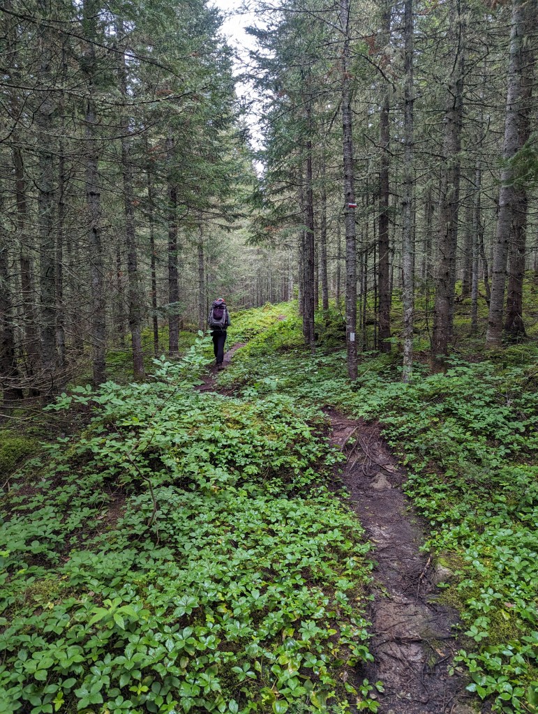 Le cinquième matin, nous nous réveillons naturellement aux aurores. Nous nous engageons dans une forêt de mousse d’un vert lime énergisant, confortable sous les pieds – thank God, après les pierres mobiles des premiers jours ! Le sol égal et spongieux nous donne des ailes. On maintient même un mode turbo à 5 km/h par moments, un exploit pour notre Traversé. Une ascension tour à tour discrète et brûlante, un sentier inondé par tronçons, et même une averse sortie de nulle part ne nous démotiveront pas. Les 20 km jusqu’au dernier refuge, L’Épervier, défilent rapidement. C’est là, vers 15h, qu’on dîne et qu’on se pose la grande question : dormir ici comme prévu ou pousser les 10.5 km restants et conclure notre Traversée aujourd’hui ? L’idée de dormir sur un oreiller le soir même, collées contre notre chat, est tentante.